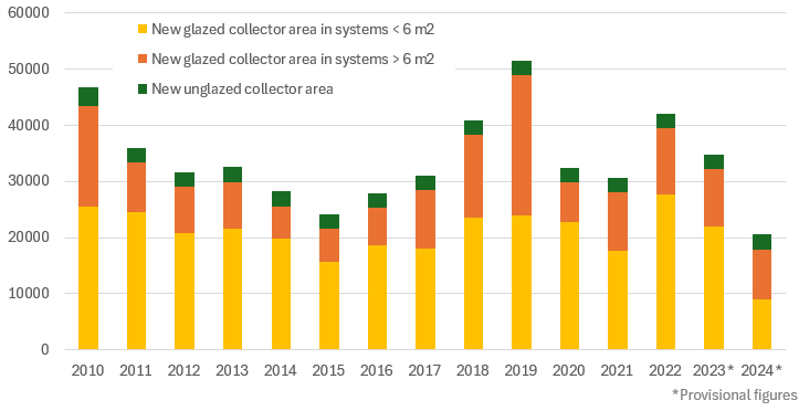 Figure 1: Market development for residential solar thermal systems between 2010 and 2024. PVT collectors and large solar district heating systems are not included in these statistics. Source: Statline open-source data